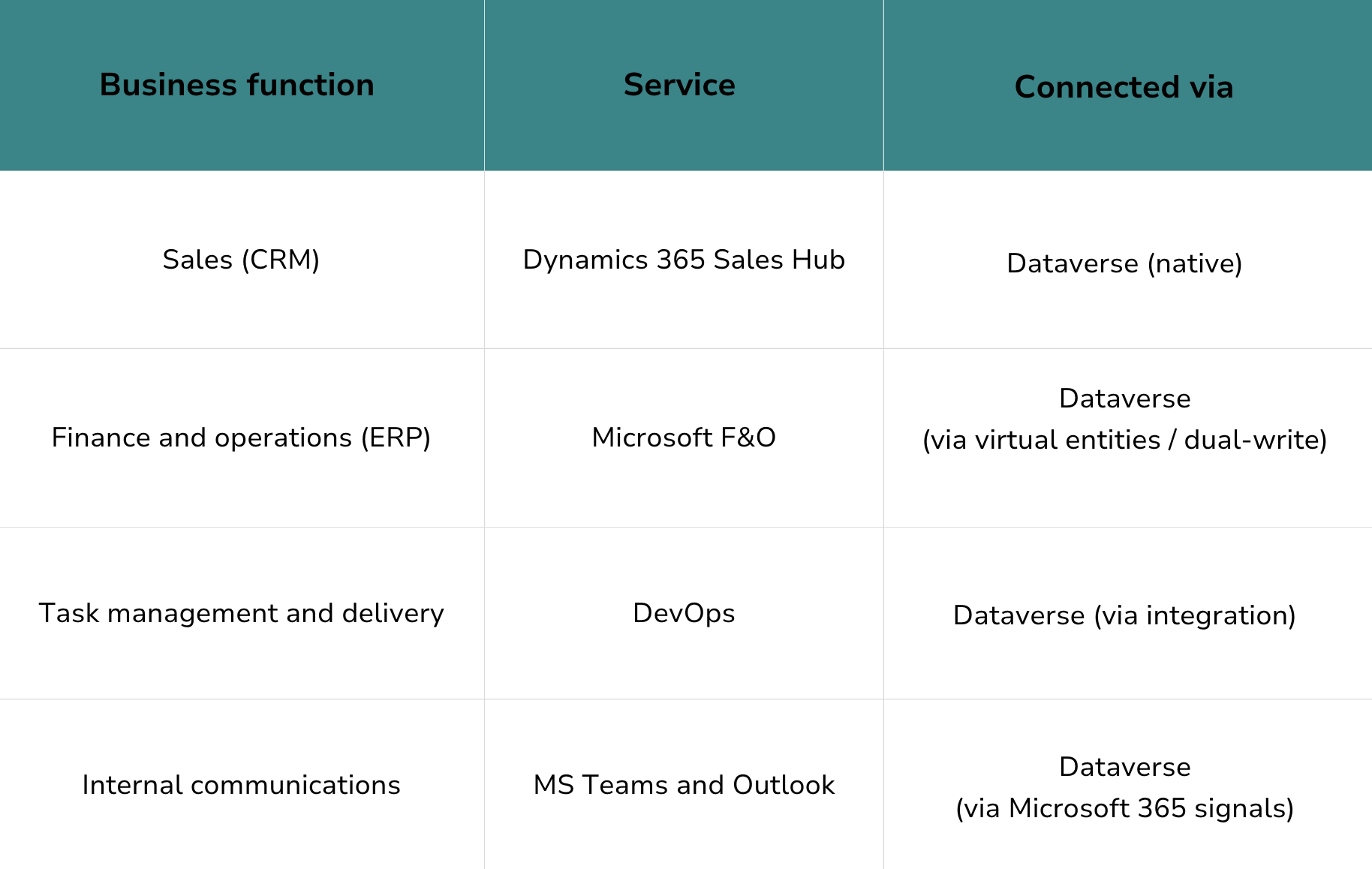 In practice, this is the role that Dataverse plays across Microsoft's business platform. It's not just a database. It's the shared backbone that CRM (Dynamics 365 Sales), ERP (Microsoft F&O), project delivery (DevOps, Project Operations), and collaboration tools (Teams, SharePoint) all treat as their native data home.
